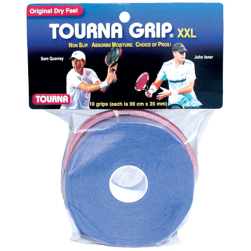 - 10 XXL GRIPS PER PACK for the largest of handles. Includes 10 strips of Finishing Tape. The Tourna-Grip Light Blue Color is a Federally Registered Trademark. You can identify Tourna Grip by its famous blue color on TV, magazines, or on the court next to you! Tourna Grip is also the only tennis overgrip MADE IN THE USA!!!