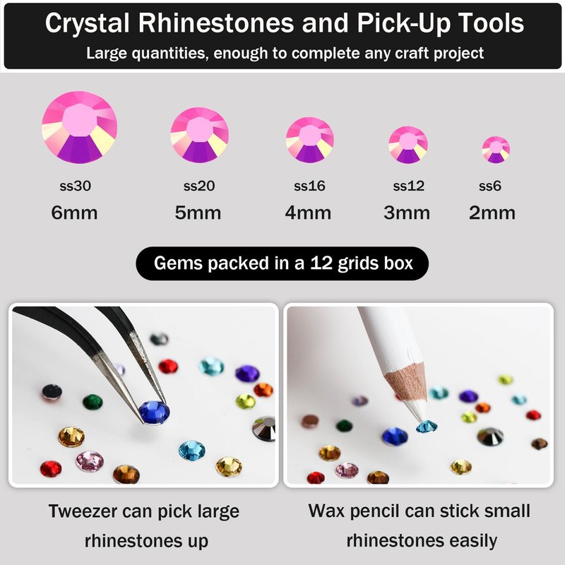 - 🌺You Will Receive: 4000pcs flatback rhinestones with 5 sizes 2mm 3mm 4mm 5mm 6mm (SS6 SS10 SS16 SS20 SS30), 3 tubes b7000 rhinestone glue (totally 30ml), 1 picker wax pencil and 1 pair of tweezers. All gems are packed in a 12 grids box according to sizes, which is convenient for you to oragnize, no worry about rhinestones mixed together.