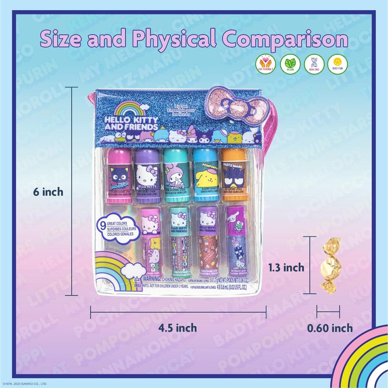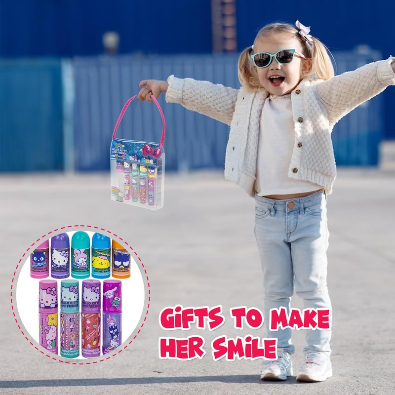 - KIT INCLUDES: 5 flavored mini lip balms and 4 flavored mini lip glosses, all wrapped up in a small PVC bag. All decorated with her favorite Hello Kitty characters.