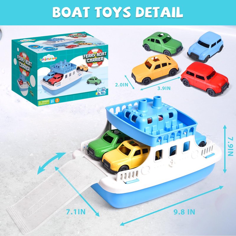 - Floating Ferry Boat: This toy boat set comes with a floating ferry boat bath toy measures 9.8’’ (L) x 7.1’’ (W) x 7.87’’ (H), Includes 4 mini car toys, Providing endless fun for toddlers during bath time.