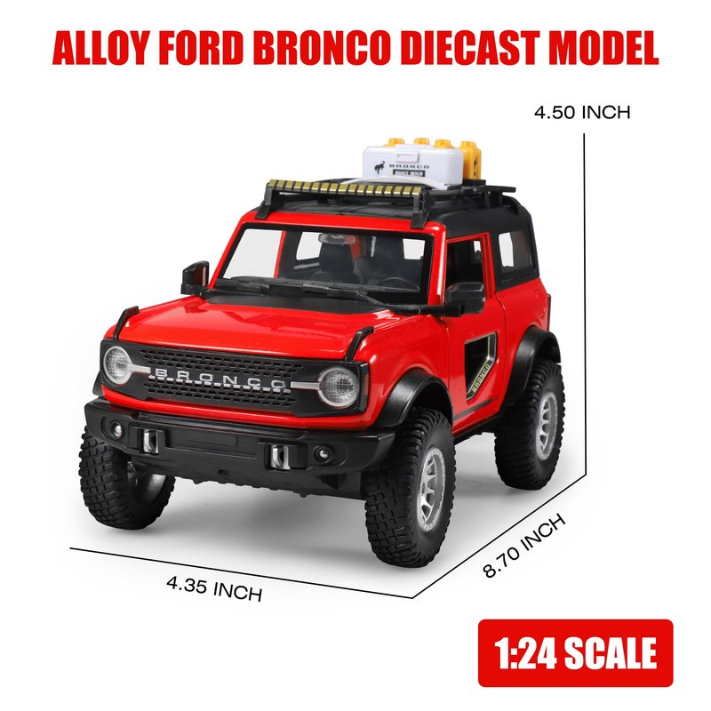 - Ford Bronco Diecast: 1/24 Ford Bronco metal die-cast model measures 8.70" X 4.35" X 4.50". This Bronco toy is crafted with realistic details of the real Bronco vehicle, a metal body with plastic parts, rubber tires, and detailed interior and exterior trim.