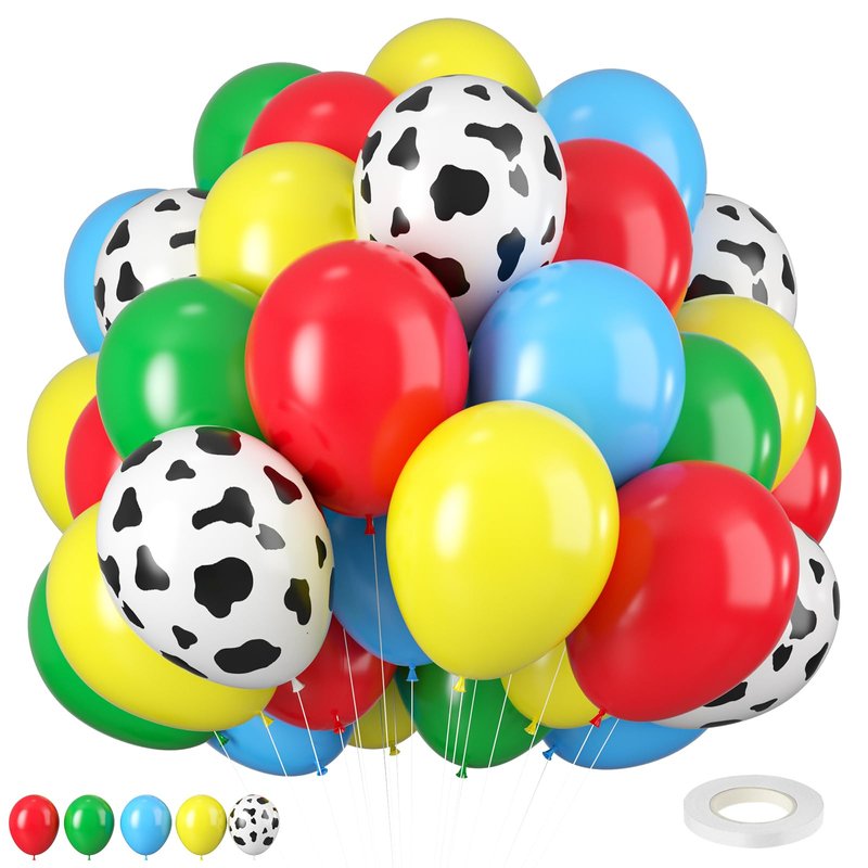 - 12 inch cartoon toy theme balloons set: Package contents include cow printed balloons, blue balloons, red balloons, yellow balloons, green balloons, a balloon ribbon. The color combination satisfies all your party imagination and starts a wonderful party carnival.