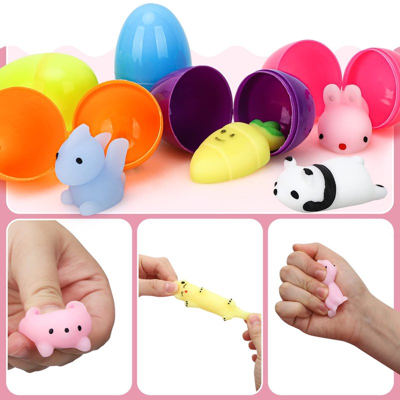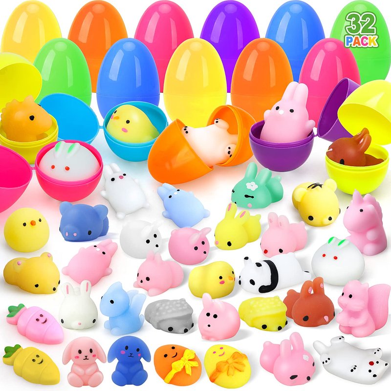 - ANIMAL STRESS RELIEVER TOYS - Animal squishy toys come in 32 different shapes and colors. The perfect easter egg for any animal loving boy or girl. Pre-filled eggs with squishy animals inside make the Easter Bunny's job easier.