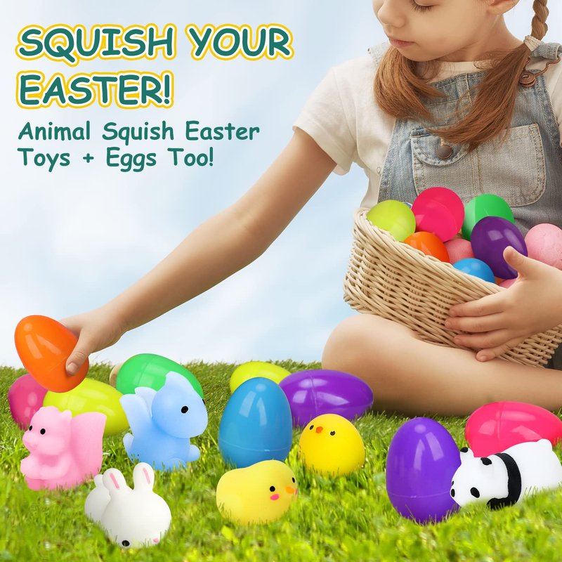- ANIMAL SQUISH EASTER EGGS - Each prefilled easter egg is filled with one of 32 different squishy toys for kids. These high-quality animal squishy egg toys are perfect for playtime and make great Easter basket stuffers for kids, boys, girls and toddlers.