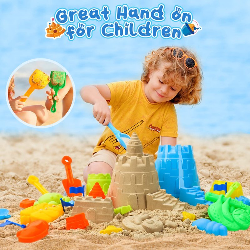 - 😀 SUPER VALUE: 36 PCS sand toy set comes with 4 sand shovels, 1 castle bucket, 4 castle molds, 1 watering can, 14 sand molds, 12 flags and 1 waterproof carrying net.Complete sand play outdoor & indoor playset, all at an incredible price! Your kid will love this sand toys set!