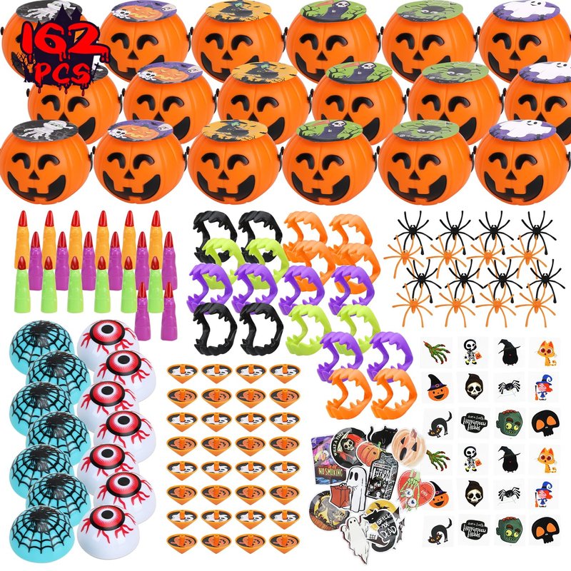 TOY Life Halloween Toys Prefilled Pumpkins Buckets Halloween Party Favors for Kids Bulk, 162Pcs Halloween Pinata Stuffers Halloween Bucket Goodies Bag Halloween Prizes Trick or Halloween Treats