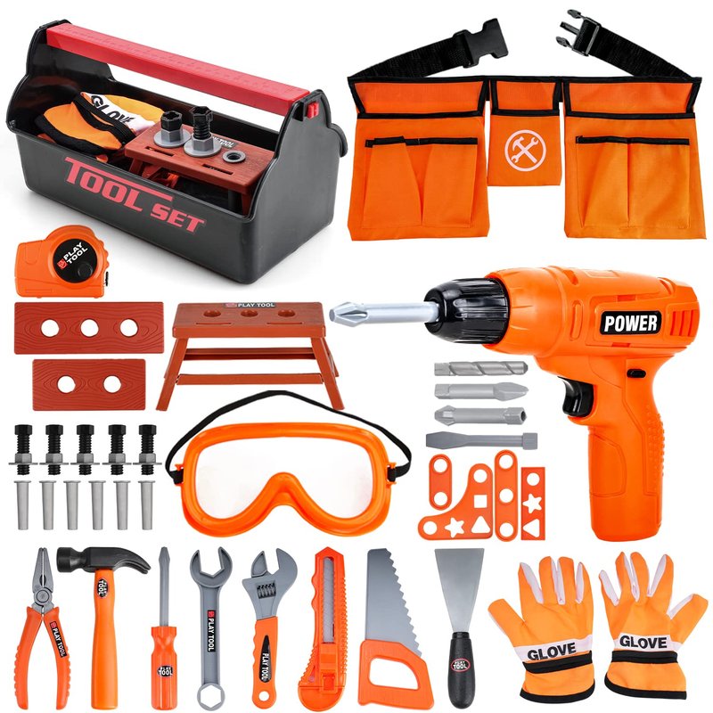 - Pretend Play Construction Tools Set - These Kits include a battery powered electric toy drill, kids tool belt, needle nose pliars, hammer, screwdriver (flathead and phillips), clamp, anchors screws, gloves, measuring tape a piece of play wood and safety goggles.