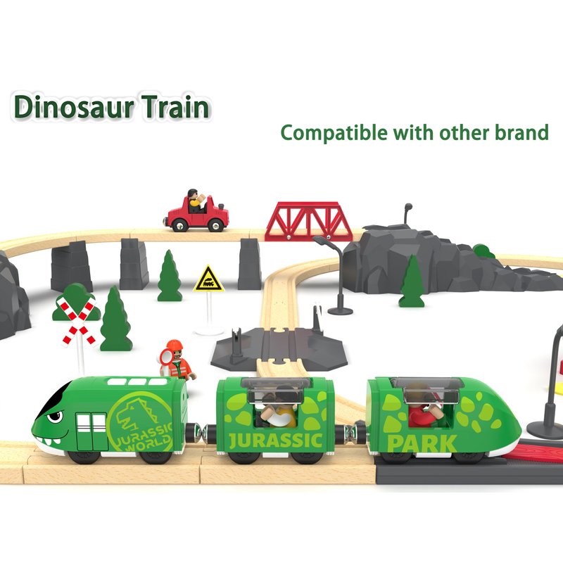- Train toys stand out in design of bullet train set and dinosaur sticker, working with standard wooden tracks, compatible with popular brands wooden railway, such as Thomas the train set, Brio trains and Ikea, kids trains seamlessly fit into existing track system.