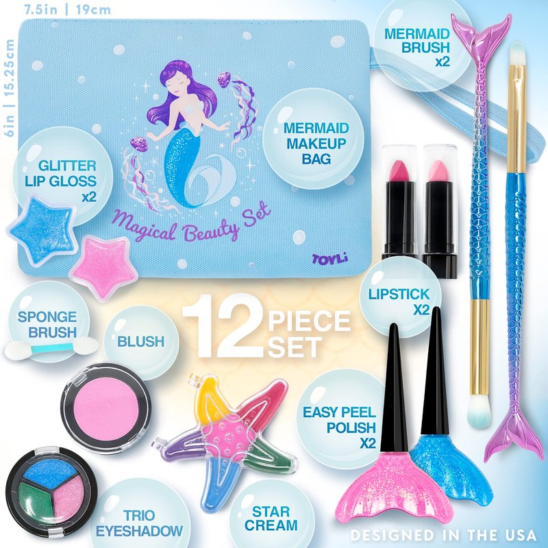 - 💄 Mess free! TOYLI kids makeup kit comes in a soft lovely bag to keep all the accessories tidy and secure and is perfect for compact travel. Makeup kit for kids includes a real eyeshadow trio, sparkle blush powder, star cream, 2 x nail polish, 2 x lipstick, 2 x mermaid lip gloss, 3 x application brushes & cosmetic bag. Meet children's curiosity about beauty. Cosmetic bag measurements: 7.5 X 6 X 0.5 Gift box measurements: 10 X 8 X 1.77