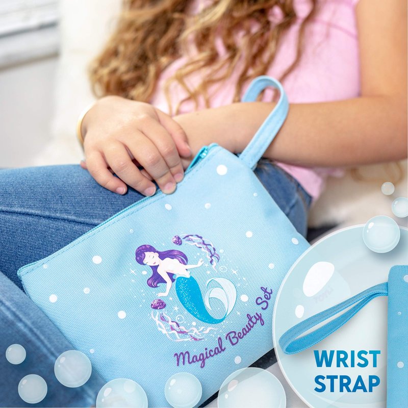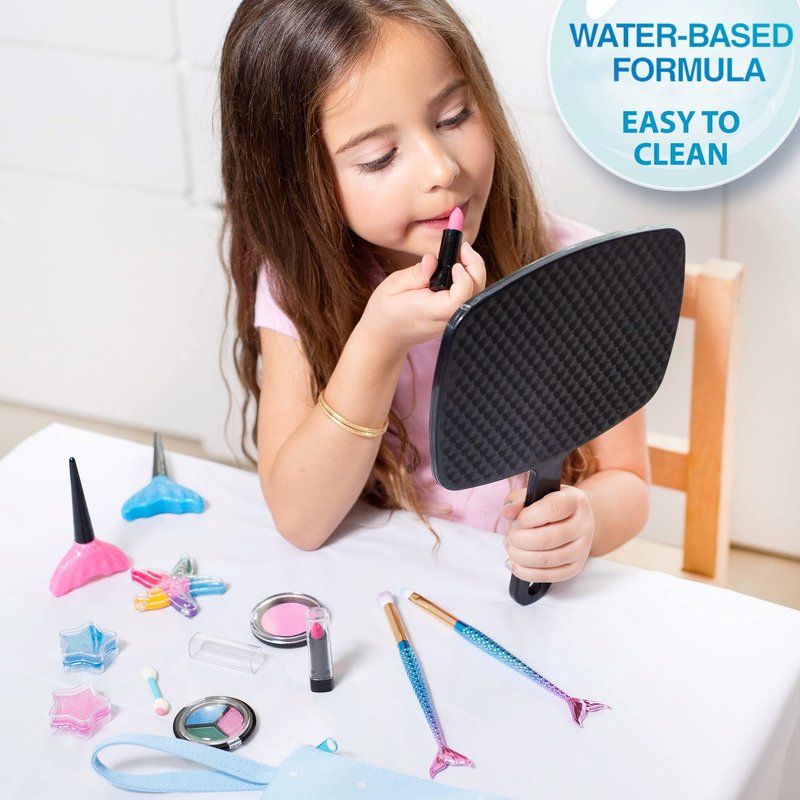 Does your little diva like to play dress-up? If so, she’ll be starry-eyed over the Toyli Magical Mermaid Beauty Set. Featuring 13 pieces in total, this sea-themed play makeup set has everything she needs to transform into a glamorous princess, Hollywood celeb or homecoming queen: Eyeshadow powder trio. Sparkle blush powder Blue star glitter lip gloss. Pink star glitter lip gloss. Pink peel-off mermaid nail polish. Blue peel-off mermaid nail polish. Star cream for cheeks or lips. Light-colored lipstick. Dark-colored lipstick. 3 application brushes with cute mermaid-tail handles. Canvas cosmetic bag with stylish mermaid design It stands up to hours of creative, engaging play, whether she’s solo or with her besties. This play makeup kit for girls 4-6 makes a splash as a gift for any occasion, from birthdays to holidays. It’s also the perfect rainy-day or sleepover activity for girls age 3-10. Ready to ignite your little girl’s imagination? Click ‘Add to Cart’ to order the Toyli kids make up kit for girls age 3 now.