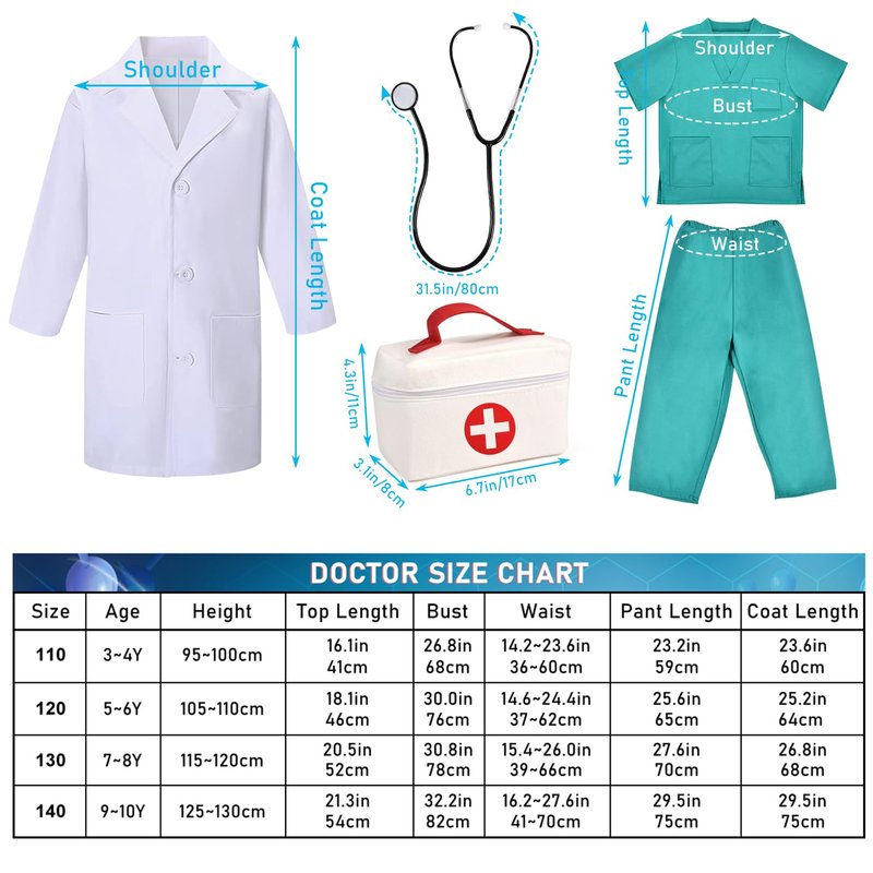 - Ideal Gift for Kids - We offer 4 sizes including XS(3-4 years), Small(4-6 years), Medium(6-8 years) and Large(8-10 years). Please choose appropriate size refer to the picture. Excellent gift for Birthday Party, Career Day, Halloween, Role Play Parties or Doctor Themed Parties, etc.