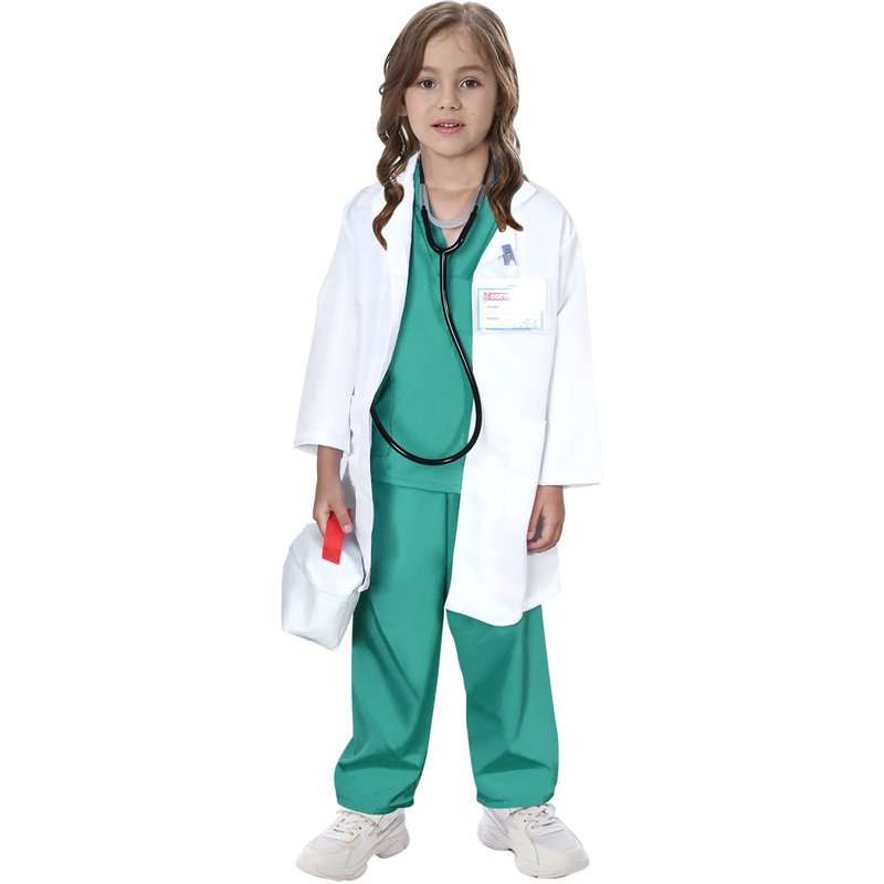 - Doctor Costume for Kids - Comes with V-neck and half sleeve top, pants, cap, white doctor coat, eyeglasses, ID card, carry bag and so on. Totally 9pcs doctor kits including the doctor costumes and accessories satisfy most need for your boys and girls.
