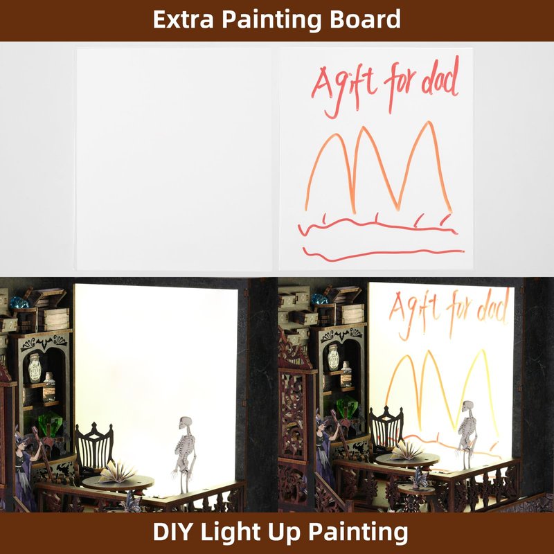 - 【New Design of TOYQI Book Nook Kit 】🧙Crafted with innovation, this bookend boasts USB power and incorporates a captivating a light up painting. It serves dual purposes: as a bookshelf book nook kit and as a decoration light up painting. The scene portrays a witch, her wand raised, reciting incantations while directing her skeletal servant. The surroundings reveal her enchanted world of magic books, gems, a tiny dragon, and potions. Yet, it's the stunning exterior landscape, brought to life through light up painting, that steals the spotlight.