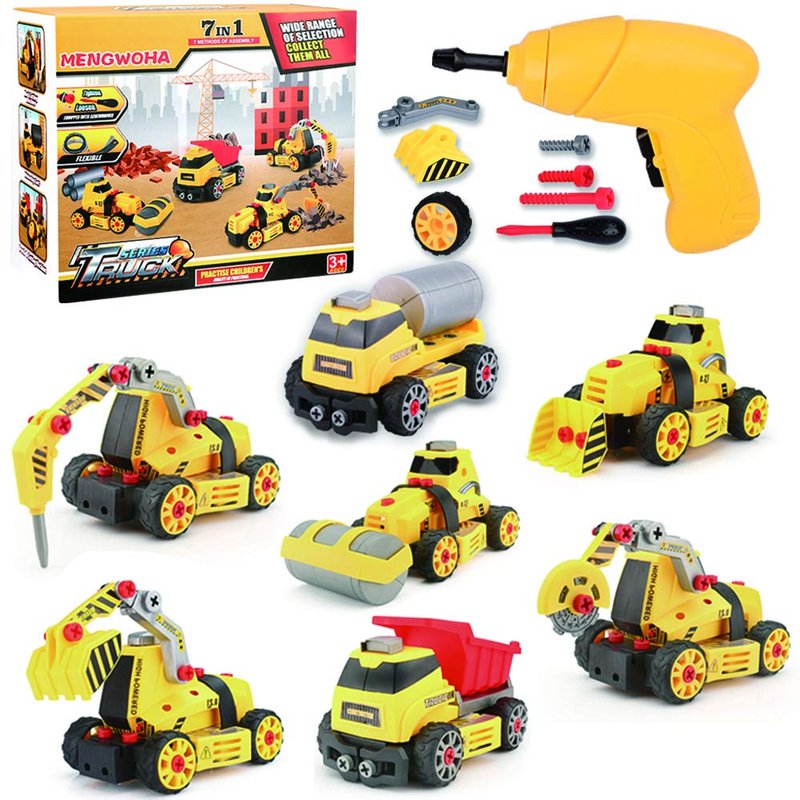 - 7 in 1 take apart toy car: The construction vehicles toy set including Lights &Sounds for even more exciting experience, Toy Power Drill for taking apart the truck models and putting them back together, Push & Go technology for extra play-ability while providing countless hours of indoor angers outdoor fun. Build 7 precious construction trucks with the 71 pieces, which develops their hands-on ability.