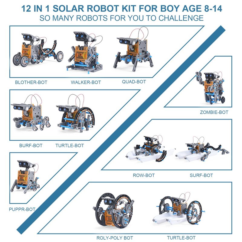 - Classic 12 in 1 Solar Robot Kit - With 190 pieces, your child can assemble 12 different robots. Powered by solar panels, it harnesses environmentally friendly and renewable energy. Each robot has its unique way of walking, capable of both land and water travel. Your kids will experience endless fun during the assembly process and enjoy the exciting adventures of these Solar Toys!