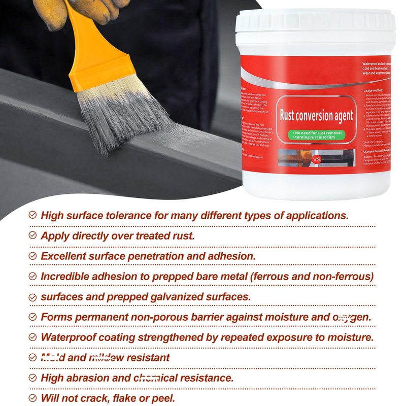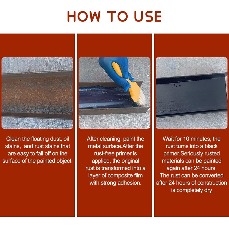 - [Waterproof] Metal Rust Remover Paint is waterproof, creating a protective barrier that prevents rust by sealing out moisture from rain and snow. It also transforms existing rust into a durable black polymer layer.