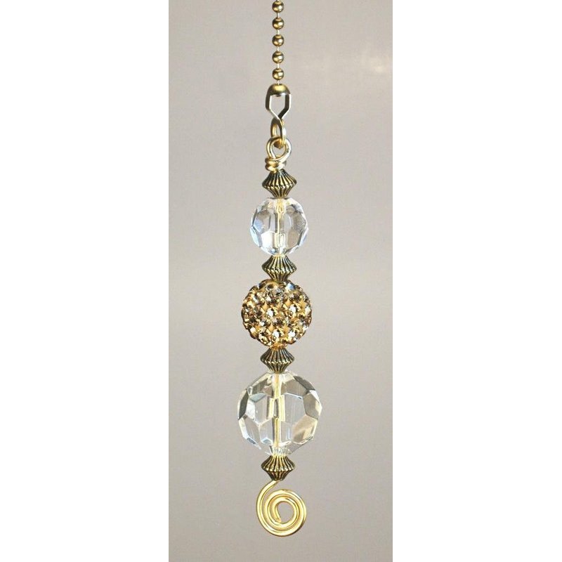 Glimmering Gold Rhinestone and Clear Crystal Glass Ceiling Fan Pull Chain. Decorative ceiling fan pull chain ornament for light and/or fan chain ends or for light pull chains. Pull is 3 inches long. Extra 4-inch long attached chain included easily snaps on or off to end connectors.