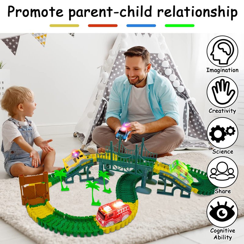- š [Fourfold Happiness] 4 different colors of light up track cars can attract kids' attention and make them feel happy. Parents can interact with kids and toddlers, boys and girls by choosing track cars, and acting as a driver of three different functions. Race track cars can not only be enhanced family relationships but also educated children about traffic safety by these track cars