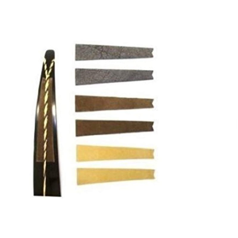 BOW STRING GROOVE SILENCERS UNIQUE ADHESIVE CUSHIONED LEATHER COLOR: BROWN These natural leather silencers dampen annoying / game spooking string slap on recurve bows. Specially designed adhesive leather with a special sound absorbing padding. Sold per 1 pair ( will outfit one bow ) Super easy to apply, will last years ! * available in 3 natural colors to compliment any traditional recurve bow ( please see our seperate ebay listings for other colors ) * PRECISION DIE CUT PROFILE WITH V NOTCH FOR EASY GROVE LOCATION AND STRING SEATING Premium Leather - MADE IN USA QUALITY All weather adhesive.