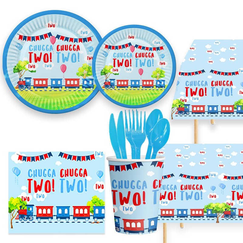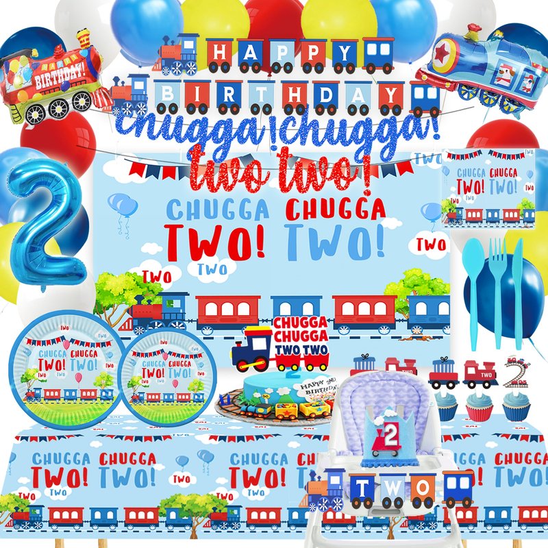 - 2-year-old train party decorations: including 1 train banner, 1 glitter train flag, 1 high chair banner, 1 cupcake topper, 1 32 inch blue digital foil balloon, 24 cake toppers, 1 Chugga chugkang background, 1 second party hat, 1 tablecloth, 2 foil balloons, 28 latex 12 inch balloons, 10 knives, 10 forks, 10 spoons, 20 tissues, 10 9-inch plates, and 10 7-inch plates.