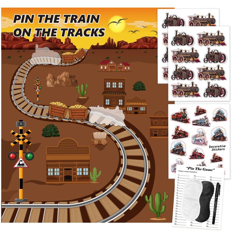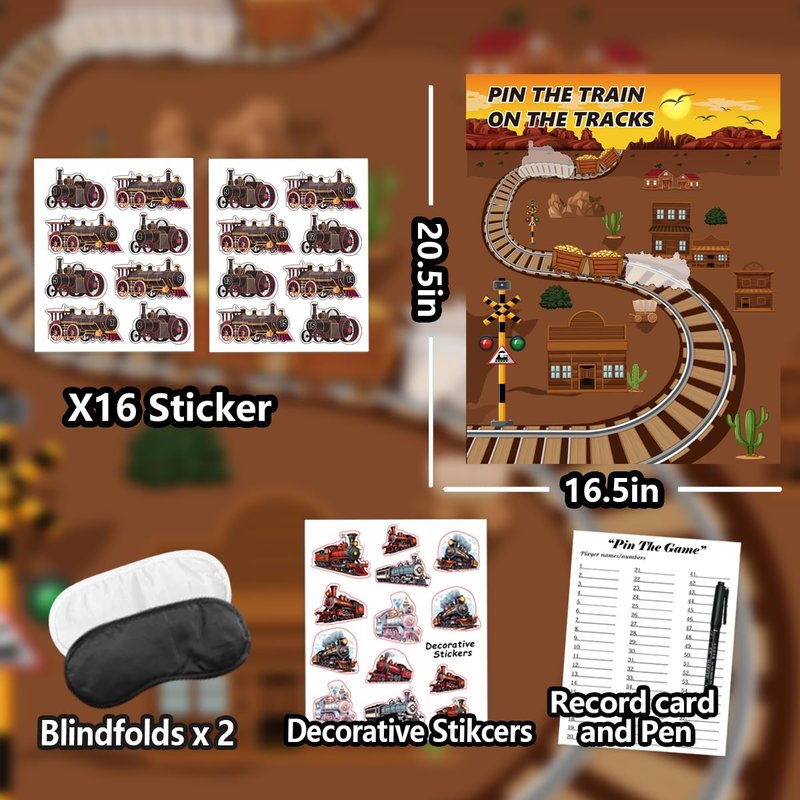 - You will receive - An cute steam train poster (16.5 x 20.5 inches), 2 blindfolds, stickers for 16 guests, 6 adhesive tapes, 1 DIY decorative stickers.