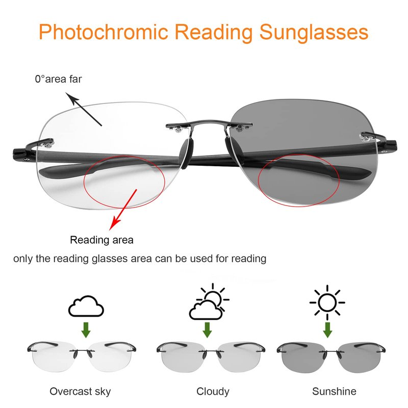 - đăSkin Friendly Material ăâ¶The bifocal sun reader is designed for comfortable daily wear with durable, lightweight, high quality frames. This casual frame and high quality silicone nose pads make it very comfortable to wear. and the lensesâ light transmittance is very good.Rimless design will keep you looking professional and fashionable while working or reading. frameless bifocal photochromic anti blue light reading sunglasses will give you the premium protection you are looking for.
