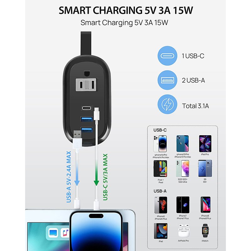 Support for more smart devices: 2 AC outlets, 2 USB-A ports and 1 USB-C port,it provide power for up to 5 devices from a single wall outlet.