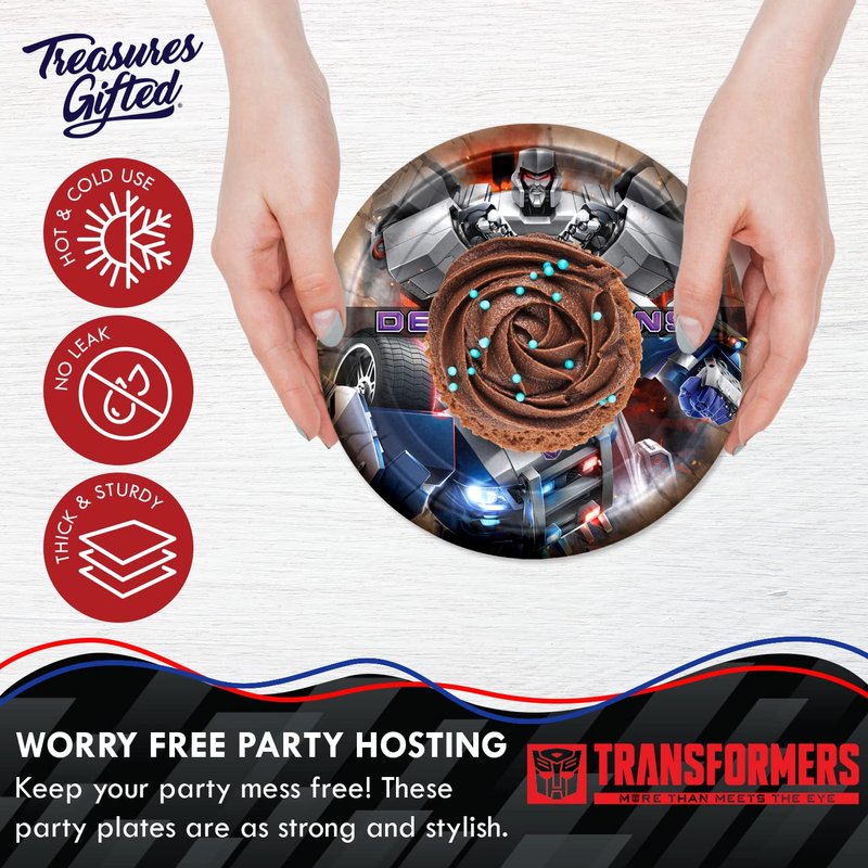 - Enjoy an epic Transformers party with our Transformers birthday party decorations. Our Transformers dessert plates feature Autobots and Decepticons to create the ultimate battle and make clean up a breeze!