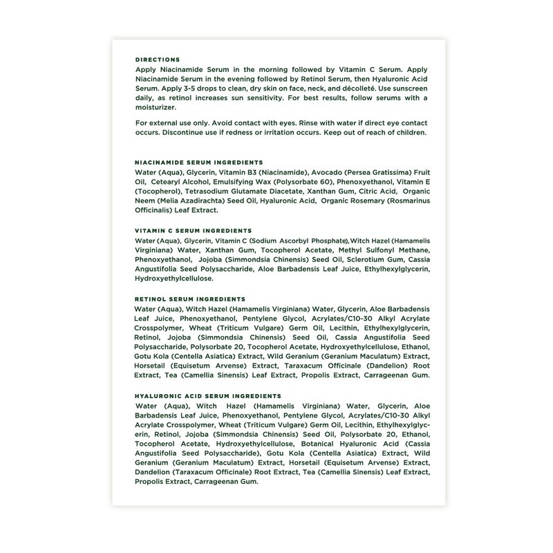 - HOW IT WORKS: Niacinamide Serum helps minimize pores, clarify the skin, and improve its overall tone. Hyaluronic Acid serum helps to hydrate, smooth and plump. Retinol Serum reduces the appearance of fine lines and wrinkles and fades the look of age spots. Vitamin C helps to brighten and smooth the skin.