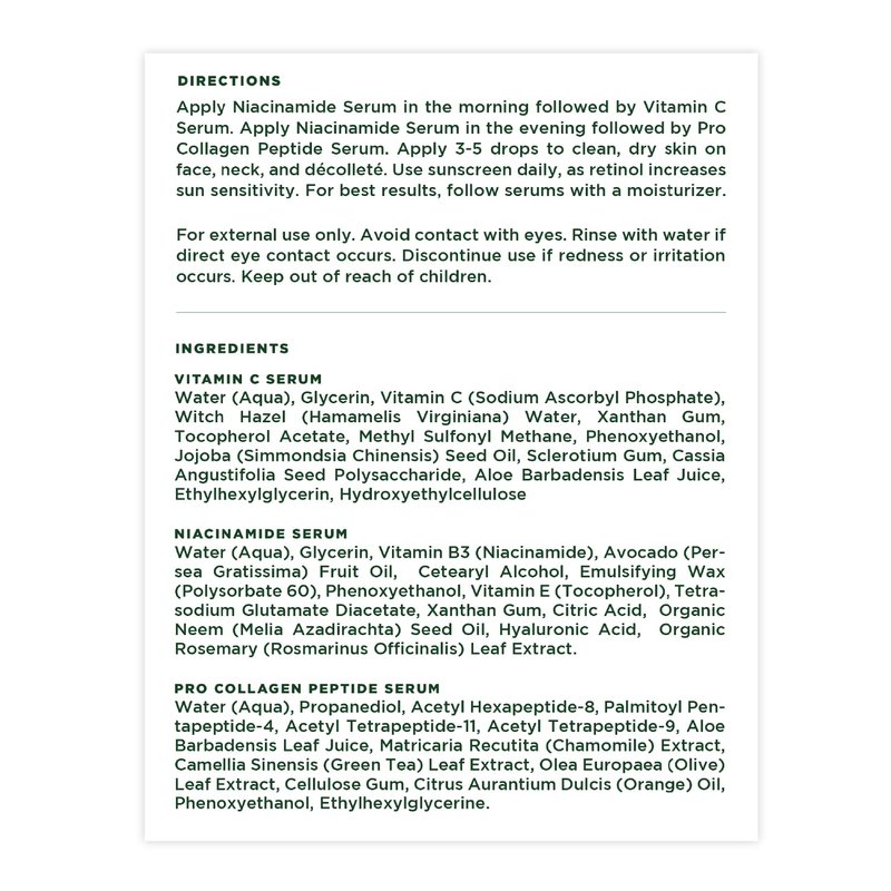 These three serums are the solution for glowing skin. This regime uses the Niacinamide serum to add moisture and support the skin barrier, the Vitamin C serum to plump and brighten complexion, and the Peptide cream for a firm finish. This trio assists with collagen production for complexion-correcting youthful radiance.