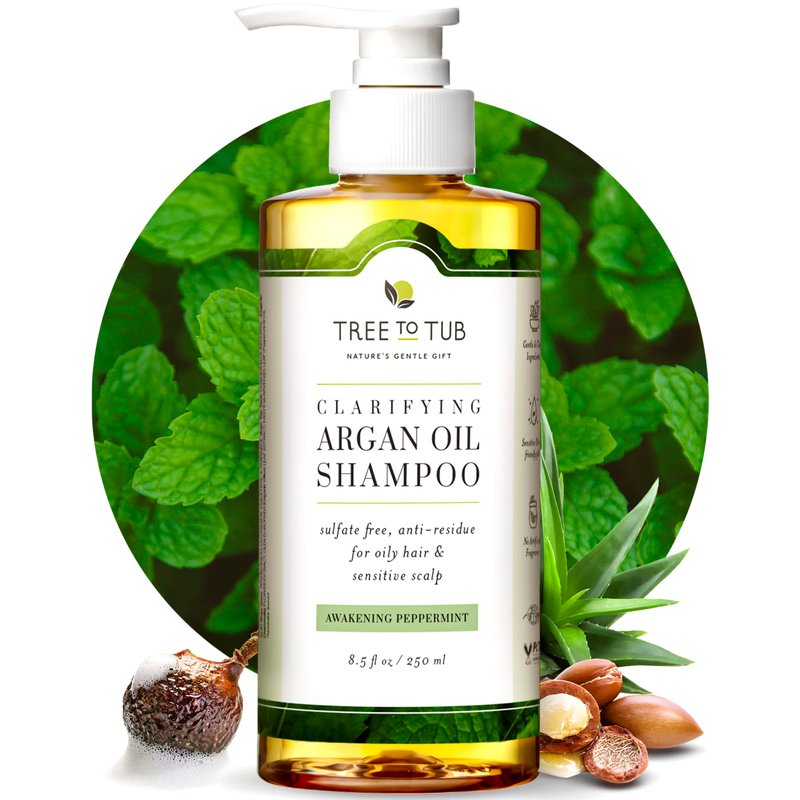 Tree to Tub Peppermint Shampoo for Oily Hair & Sensitive Scalp - Gentle Clarifying Shampoo for Build Up, Sulfate Free Anti Residue Hair Shampoo for Women & Men w/Organic Argan Oil, Natural Aloe Vera