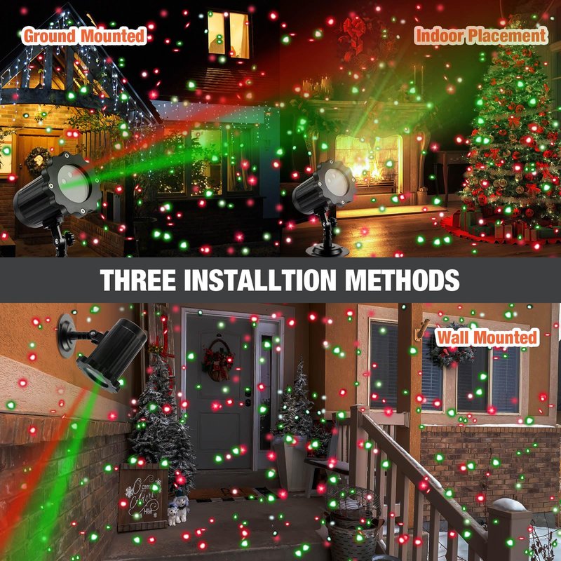 - Easy to Use: just install the base or long ground stake and connect the plug, then you can use the Xmas display projector lights; It can be inserted into the ground, or placed directly on the ground or installed on the wall by replacing it with a round base; The remote included in the package can work within a range of 50 ft, and according to the instructions, you can use it freely adjust the mode and work time of the projector lights