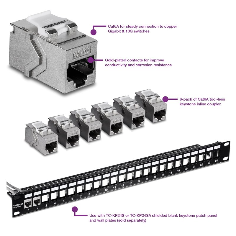 - 6-PACK OF CAT6A INLINE COUPLER KEYSTONE JACKS: Includes six Cat6A tool-less keystone jacks to be used with TRENDnet’s Blank Shielded Keystone Patch Panels and wall plates