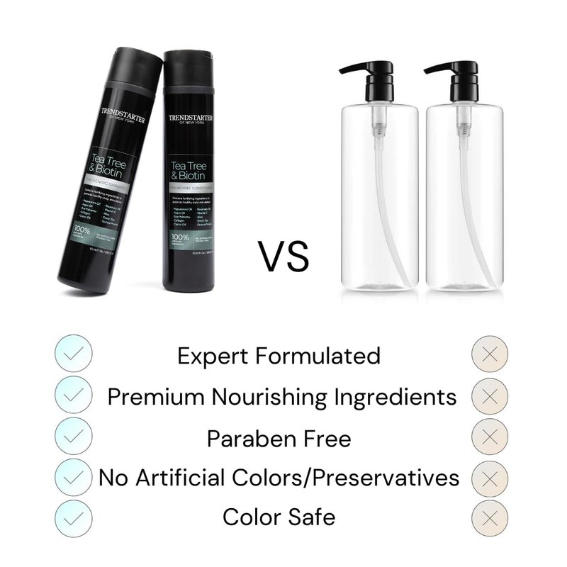 TRENDSTARTER TEA TREE & BIOTIN THICKENING CONDITIONER Formulated for all hair types, our conditioner hydrates, detangles, and adds moisture without weighing the hair down. It is crafted with ingredients that promote hair health in every way. PREMIUM INGREDIENTS Carefully crafted using the highest quality nourishing ingredients, Tea tree, Transforms your hair by starting at the scalp. Properties make it a potent treatment for overall scalp health. Biotin, Promotes hair growth by enhancing keratin production. Peppermint oil, Activates scalp circulation, helping to slow down hair loss and hair thinning. Argan oil, Increases hair's elasticity and consistently restores shine and hydration. It prevents breakage and damage from free radicals. Saw Palmetto, Blocks DHT production, a hormone responsible for hair loss and thinning. Collagen, Improves elasticity, structure, and strength in the dermis, the layer where your hair root resides. Castor oil, Boosts hair growth up to five times. PARABEN & CRUELTY FREE TRENDSTARTER products are not tested on animals and are free of parabens and harsh chemicals. MADE IN THE USA All of TRENDSTARTER products are proudly made in the USA.