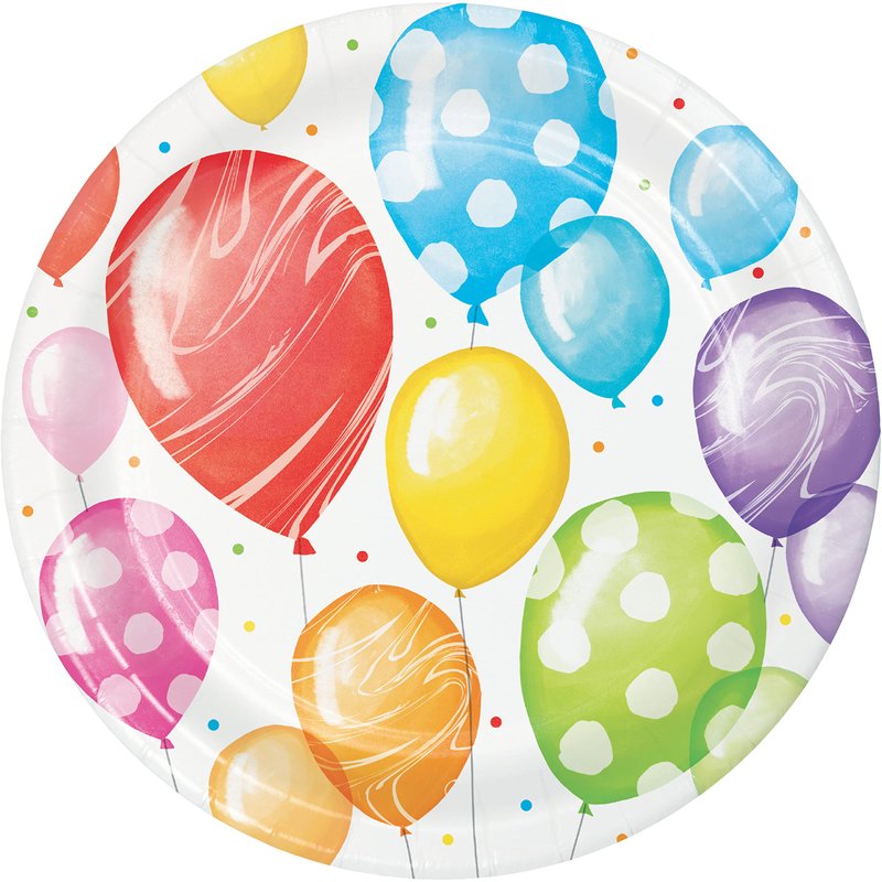 Serve up any sweet treat on these Balloon Bash Dessert Plates. Displaying a colorful balloon design, these plates are the perfect backdrop for your desserts. Measuring 7" and sold in packs of 24, these plates can be paired with any other Balloon Bash party supplies.