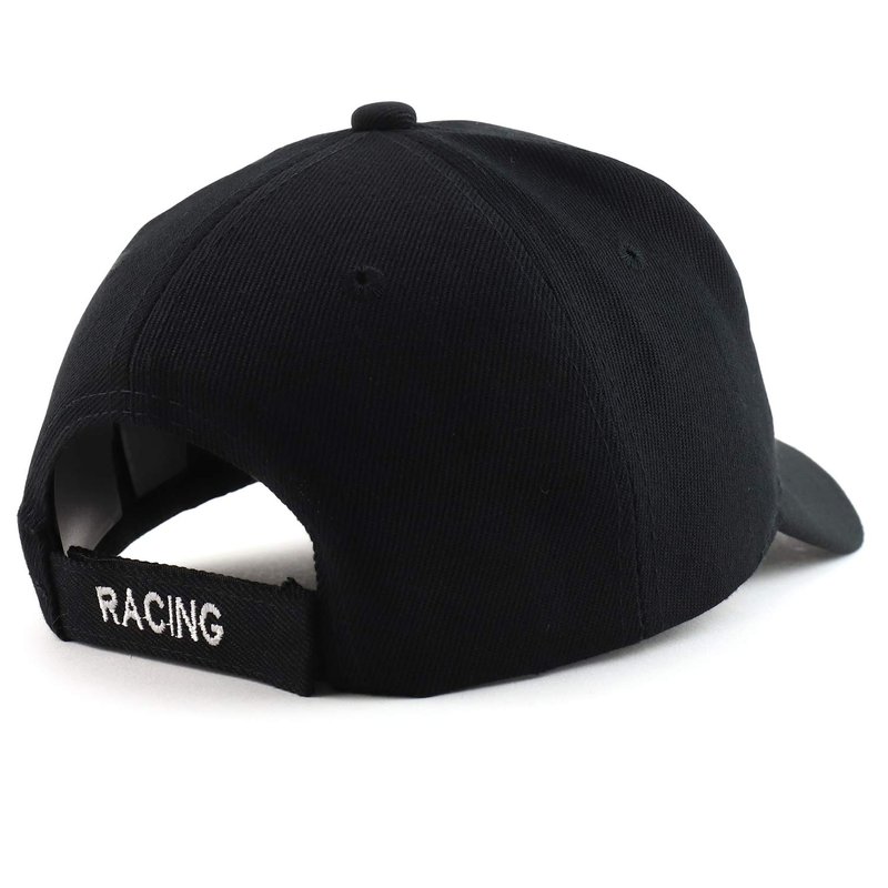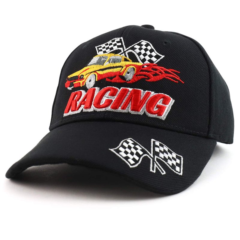 Trendy Apparel Shop Racing 3D Embroidered Flame Car Race Flag Baseball Cap. 100% Cotton. RACING in 3D with flame car and race flags is embroidered on the front. 6 panels, mid profile, structured crown. Stiff and pre-curved bill, same color under bill, car race flags are embroidered on the side of bill. Finished with an adjustable hook and loop closure, RACING embroidery on the back strap. One size fits most.