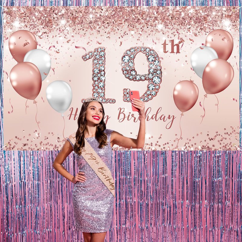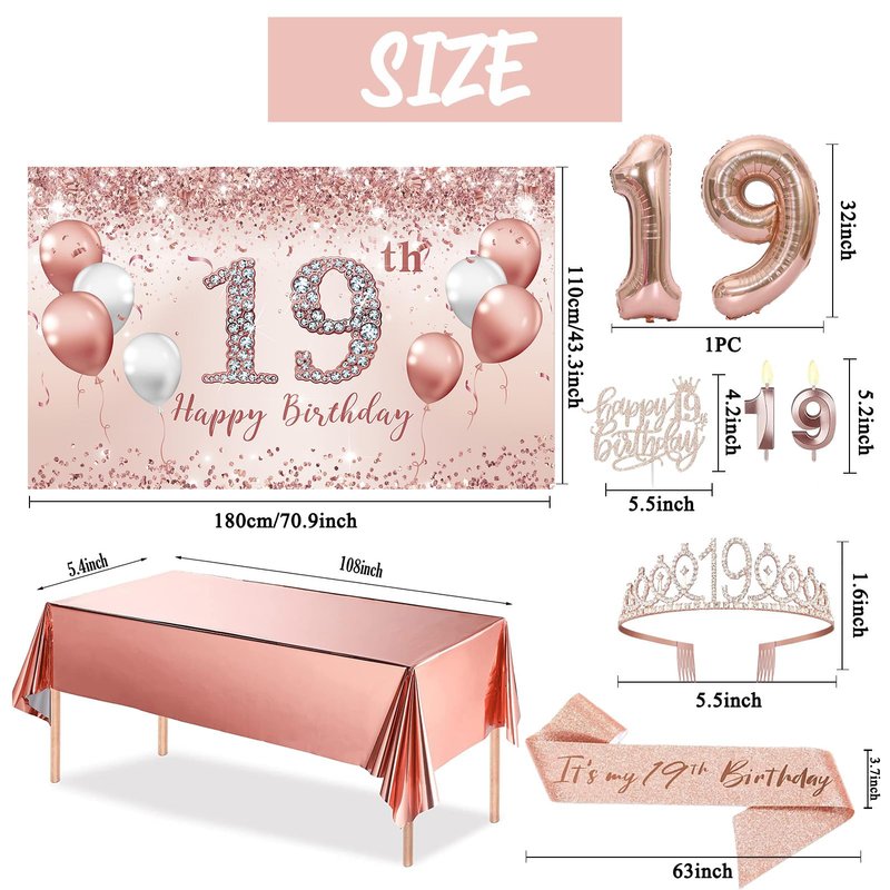 Trgowaul 19th Birthday Decorations Set. It is large enough for your birthday party. What will you get: 1 x Rose Gold Backdrop banner 70.8 x 43.3 Inch, 1 x Rope. 1 x 19 Birthday Crown, 1 x 19 Birthday Sash, 1 x pearl pin, 1pc happy 19th birthday cake topper, number 19 balloons 32inches, 1pc rose gold tablecloth Attention please: 1.Each computer color correction will be different, subtle color difference is common. 2.At the same time,because of our background material or pattern ink in different batches,the background when printed will have very small difference. 3.The background pattern is digitally printed with high quality.4.Folding packaging: The package is folded and may have creases. If you care about creases, iron the back with a low heat steam iron or roll it up with a long tube for about 3-4 days. Don't use a dry iron. How to hang up? Each corner of our birthday backdrop has a hole. So you can string the hole with the rope we sent, and then hang them where you want. Or you can use clips, tape or pushpins to hang the background on the wall.