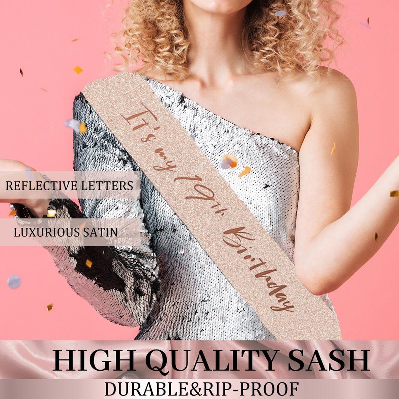 - 👑[19th Sash for girls] The rose gold birthday sash is made from high quality glitter fabric and printed with rose gold foil words. Elegant and gorgeous! The sash is in 63inch length and comes with a pretty pearl pin. You can adjust the length by using the pearl pin in the package. Th pin also put the perfect finishing touch on your party outfit.