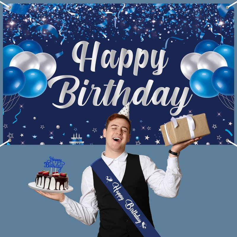 - [Blue Birthday Set Decorations Include] The birthday party balloons set contains - 1 pc navy blue birthday backdrop (70.8 x 43.3 inches), 6PCS hanging swirls, 6PCS honeycomb ornament, 6PCS paper honeycomb balls, "HAPPY BIRTHDAY" flag * 1, 1pcs sash and happy birthday cake topper.