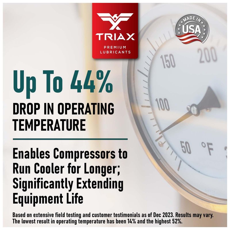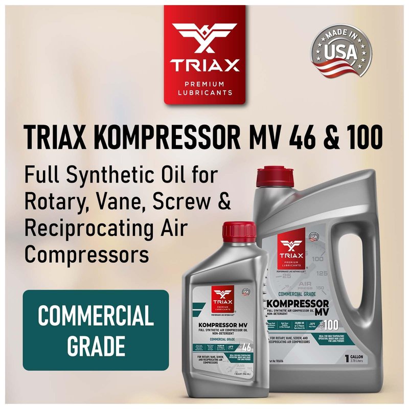 TRIAX Kompressor MV ISO 46 (SAE 20) is a multi viscosity, full synthetic premium air compressor and power tool lubricant designed for most screw, rotary, vane and reciprocating air compressors in both regular and severe service applications. This product features an exceptional quality blend of synthetic base oils and top tier additive chemistry to facilitate outstanding, long term performance and protection for air compressors. It is not recommended for breathing air pumping compressors, oxygen compressors, or LPG compressors fitted on natural gas pipelines. This fluid is NON-DETERGENT.