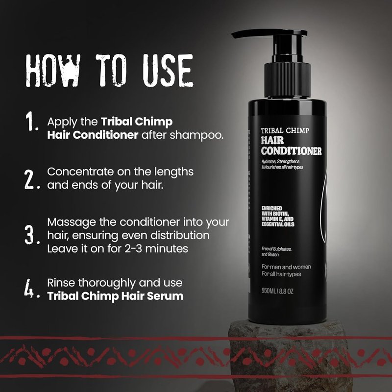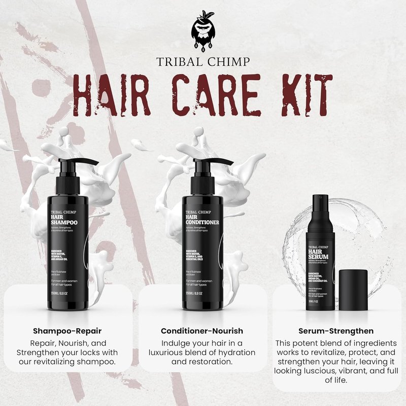 Revive, strengthen, and nourish your hair with Tribal Chimp’s moisturizing conditioner, meticulously engineered to deliver serious results for all hair types. This luxurious hair conditioner for men combines nature's finest ingredients with advanced hair care technology, providing the ultimate blend of hydration and protection. Packed with peppermint, vitamin E, avocado oil, wheat oil, olive oil, costus oil, biotin, and tea tree oil, this hair conditioner for women and men boosts elasticity, repairs damage, and refreshes your scalp. Free from harsh chemicals and sulfates, our hydrating conditioner prioritizes your hair’s health, offering a top-tier grooming experience that leaves your hair looking vibrant and feeling irresistibly soft. Simplify your hair styling routine with a complete hair care solution. Pair our shampoo and conditioner with the serum to cleanse, nourish, and protect your hair from root to tip. Infused with ingredients that work in harmony, this dynamic trio enhances shine, reduces breakage, and improves overall manageability. Say goodbye to dryness and hello to fuller, healthier hair that reflects your style and identity with every strand.