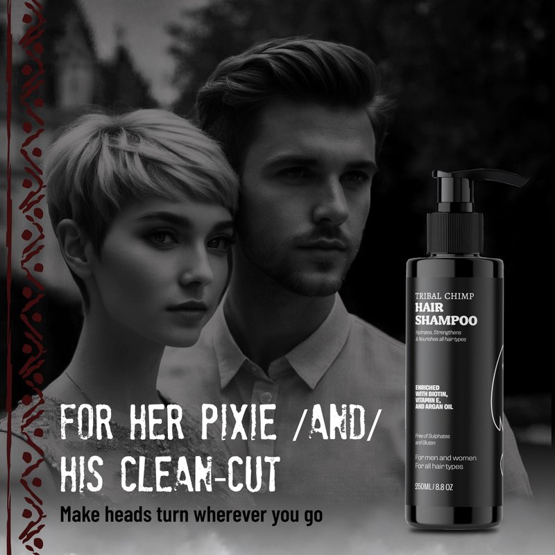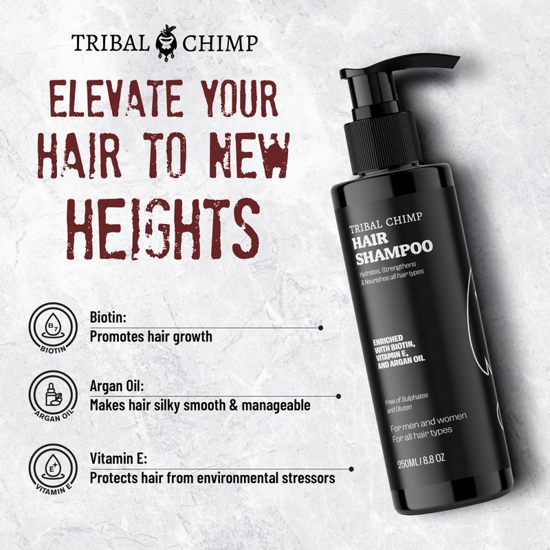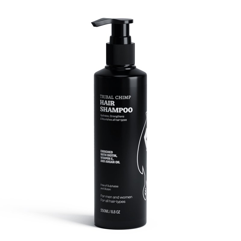 Unlock your hair's full potential with Tribal Chimp Hair Shampoo, our strengthening and hydrating shampoo made with a commitment to quality and effectiveness, offering a truly superior and transformative hair care solution. This oily hair shampoo is made with the finest ingredients such as Argan oil, biotin, Costus oil, Vitamin E, and polyquaternium, an agent that helps this women’s and men shampoo improve manageability and enhance texture. The Argan oil in this women's and mens shampoo makes your hair smooth and manageable, the biotin promotes healthy hair growth and prevents breakage, the Vitamin E protects your hair while the costus oil helps soothe and calm your scalp. To use this women’s and men’s shampoo, thoroughly wet hair, apply Tribal Chimp dry scalp shampoo focusing on the roots, lather, and leave for a few minutes. Use Tribal Chimp Conditioner after for best results. Yes, this is the shampoo women and men need! Your hair is your crowning glory, as each strand forms a whole expression – an extension of who you are. Tribal Chimp knows how much you care for your hair, and through our various women’s and mens hair products, we aim to ease your experience but with amazing, much more stylish results. Add our hair care kit to your hair styling accessories.