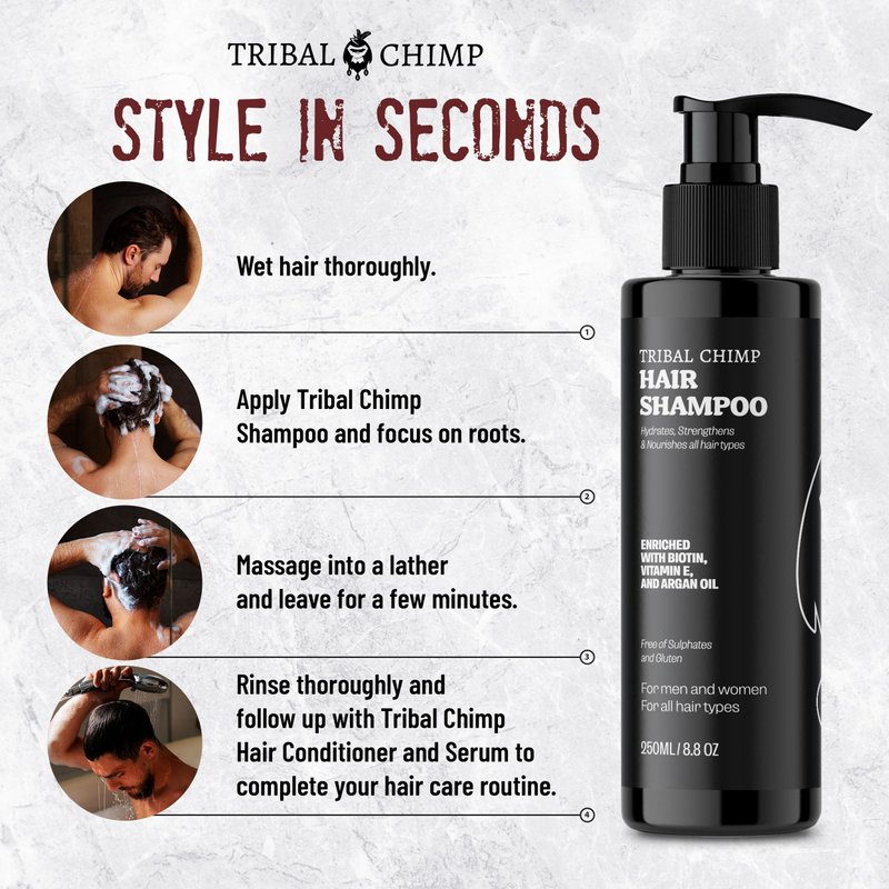 - See the difference for yourself - Thoroughly wet hair, apply Tribal Chimp Hair Shampoo, focusing on the roots, lather, and leave for a few minutes. Use Tribal Chimp Conditioner after for best results. Yes, it is that easy to use this biotin shampoo!