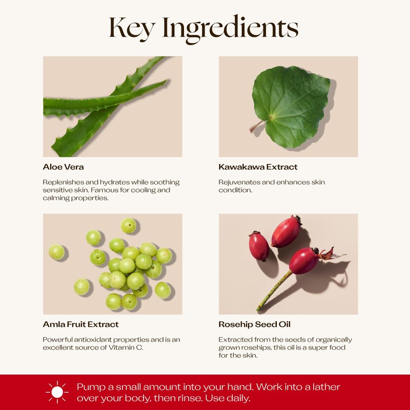 - Nourishing Rosehip Oil: Our iconic rosehip seed oil deeply nourishes and renews skin with each wash