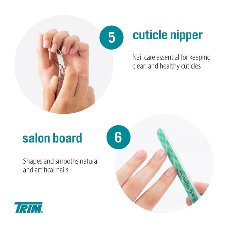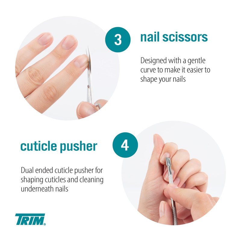- MANICURE & PEDICURE KIT – This set of TRIM personal care items includes a fingernail clipper, toenail clipper, nail scissors, cuticle nipper, a cuticle pusher, nail brush, salon board, and a 4-step buffing board – all in a convenient plastic pouch
