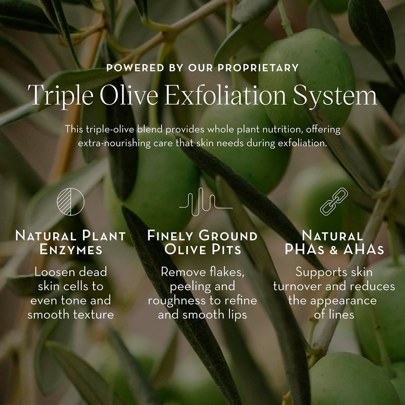 - Triple-Exfoliating Formula: Combines olive pit powder, sugar, and fruit enzymes to gently buff and smooth lips, promoting natural cell renewal.