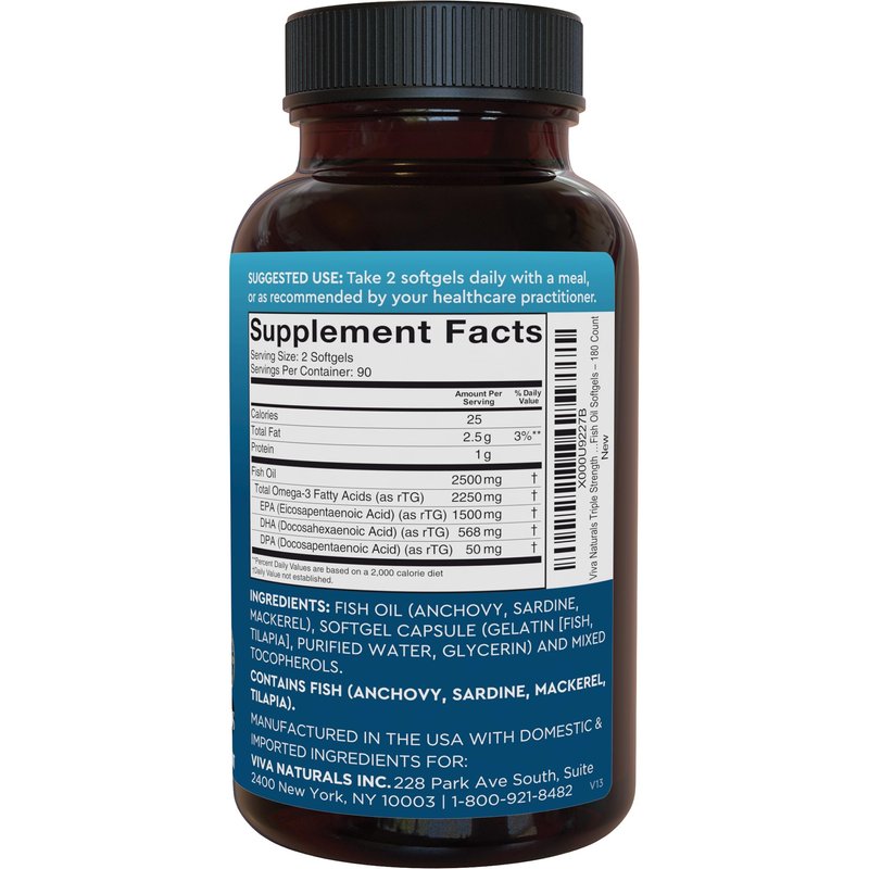 With just two softgels, Viva Naturals Triple-Strength Omega-3 Fish Oil goes beyond what you’d get from ordinary omega 3 fatty acid supplements, providing 1,500 mg of EPA, 568 mg of DHA and 50 mg of DPA. These are the essential Omega-3 fatty acids that give your body the nutritional support it needs.* Brain, heart, eye, skin health – you name it.* Many EPA and DHA supplements come as ethyl esters, which your body needs to break down into digestible triglycerides. Viva Naturals’ Fish Oil provides omega-3s in the re-esterified triglyceride form. This means they put less stress on your digestive system, making them easier for your body to absorb and utilize.* Because it’s purified without hexanes to preserve the quality of the oil and highly refined, odor and dreaded “fish burps” are completely minimized. Our oil is made with fish that are wild-caught using responsible fishing practices, our product is of the highest quality and standards, and third-party tested to ensure purity and safety. If you’re looking for a high-quality fish oil supplement that’s gluten free and dairy free, you’ve found it.