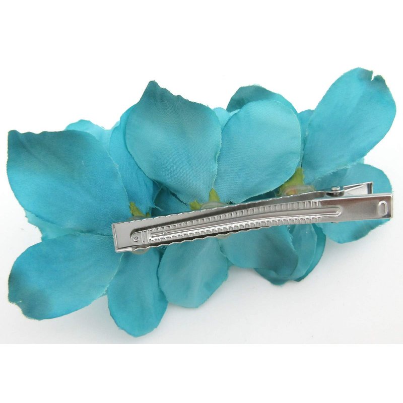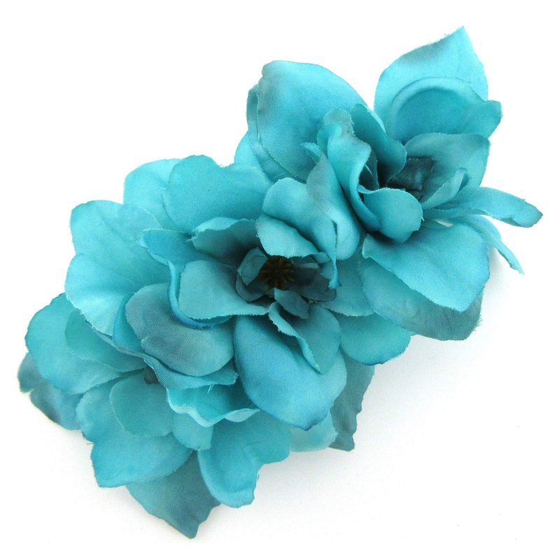 Triple turquoise silk flower apple blossoms, each attached to a large 3" rectangle alligator clip with teeth for extra hold. Perfect finishing touch to a pin up or updo, headband or beanie....clip to your favorite scarf or hat! Cluster a few together for a larger flower look & bridal.