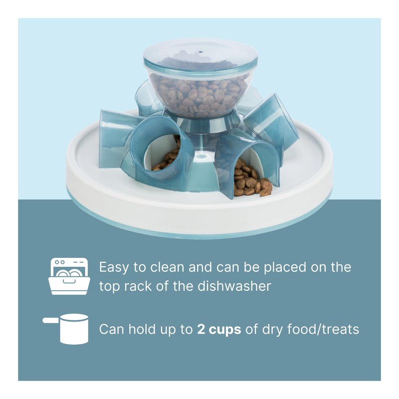 - Interactive puzzle powered by treats; can hold up to 2 cups of dry food