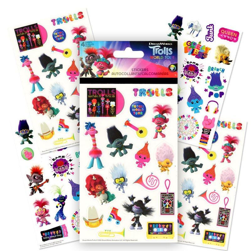 - 2 Trolls Stickers 4 sheet stickers packs (Trolls, Trolls world tour): Colorful stickers featuring many favorite trolls characters from the movie